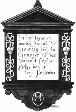 Boven de graftombe hangt het grafbord van Aernout van Cruininghe, waarop staat dat hij de Heer van Cruininghe en van Voorhoute was en dat hij is overleden op 3 september 1561.